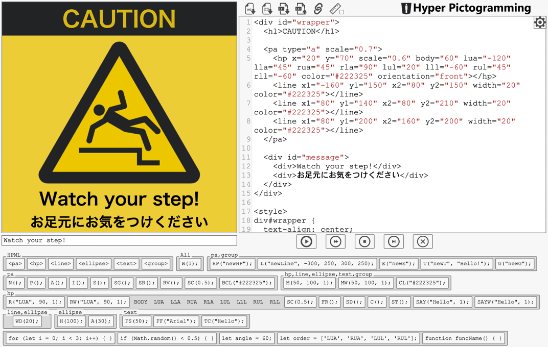 まるでWebページをデザインするかのように,多彩なピクトグラムコンテンツを作成できます.複数の人型ピクトグラムを非同期で動かすこともでき,また自由自在にカラーカスタマイズすることで,インタラクティブかつ魅力的な表現を実現できます.HTML,CSS,JavaScriptの学習にお役立てください.